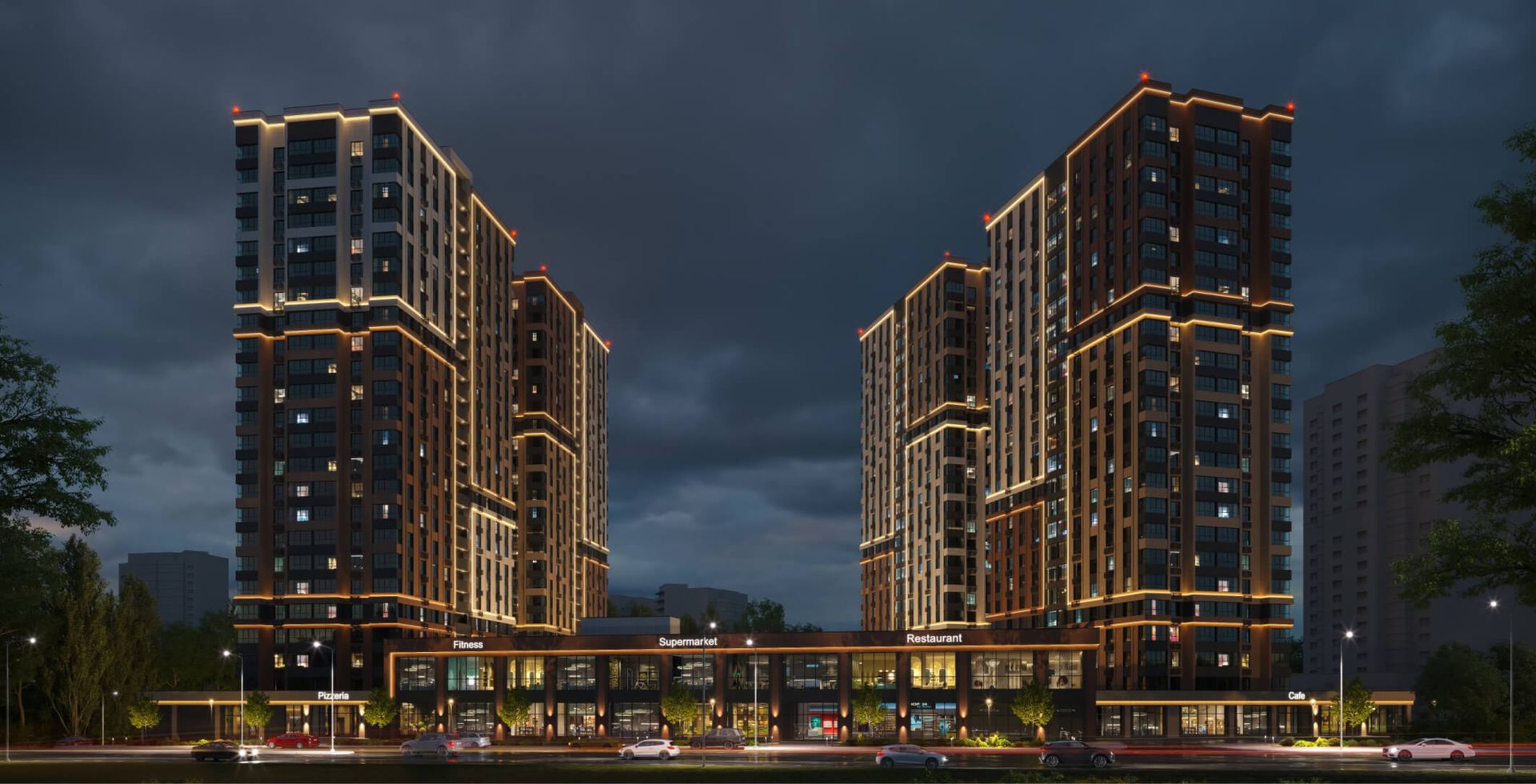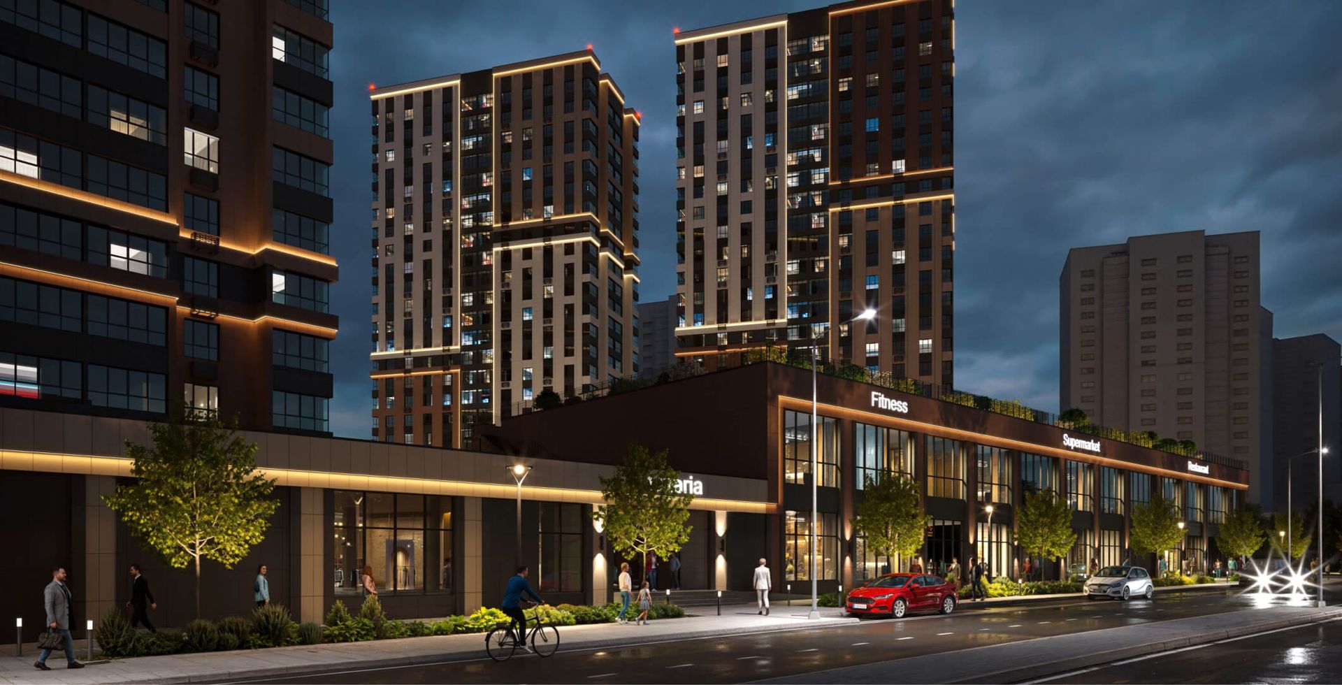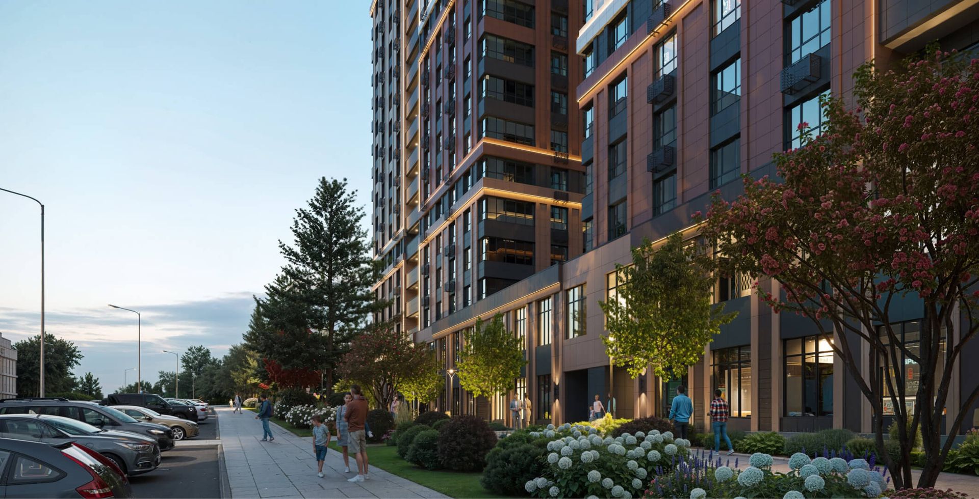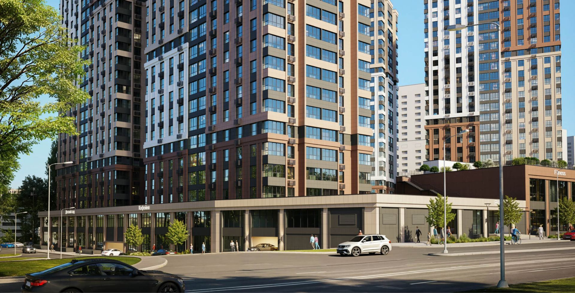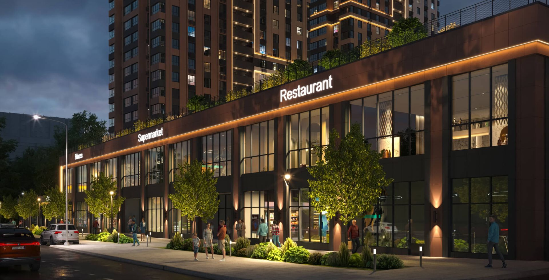 На первых этажах квартала расположены помещения в формате «Step inclusive» - в шаговой доступности образовательные и коммерческие сервисы, коворкинг, кофейни и рестораны. Все секции объединены в единую архитектурную форму с коммерческими помещениями. Между первой и второй секцией на крыше организована площадка для отдыха и любования звездным небом.