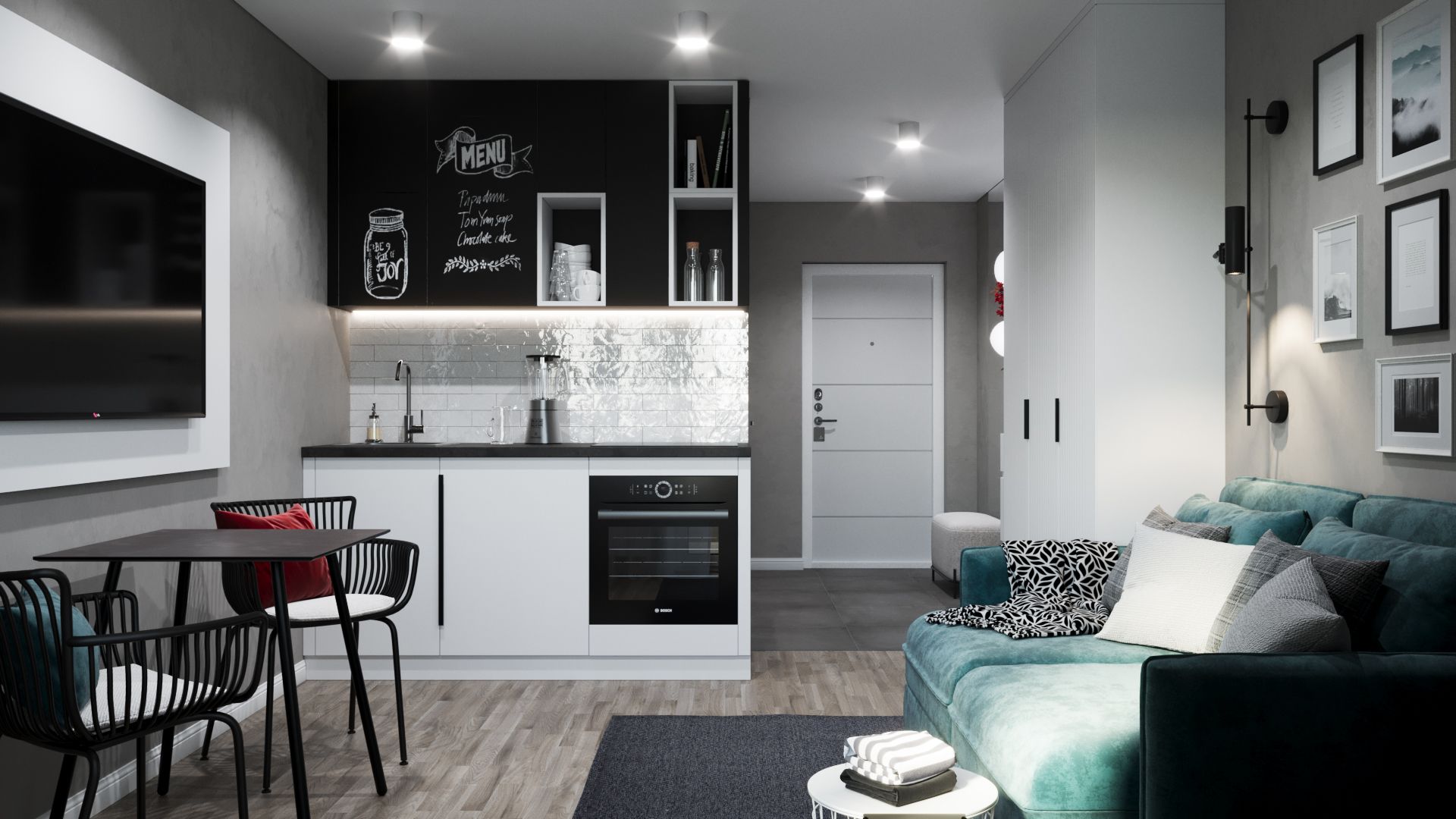 Компактная студия с лоджией. Отлично подойдет тем, кто предпочитает быстрый темп жизни. Конфигурации и площадь квартиры позволяют оборудовать комфортное рабочее место для человека, работающего на удалёнке, а также функционально разделить пространство квартиры на спальное место и зону готовки. Встроенная мебель и техника, эргономичный раскладной диван и лаконичный дизайн интерьера придадут данной квартире особый шарм. Хорошее решение для тех, кто только начинает самостоятельную жизнь.