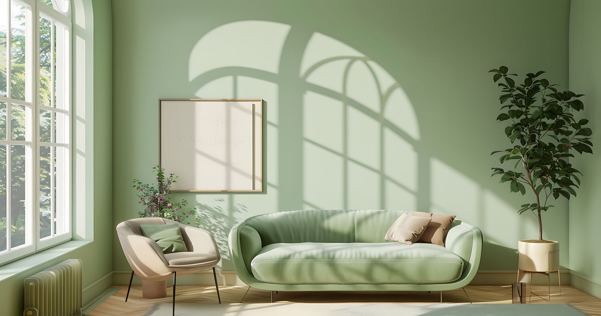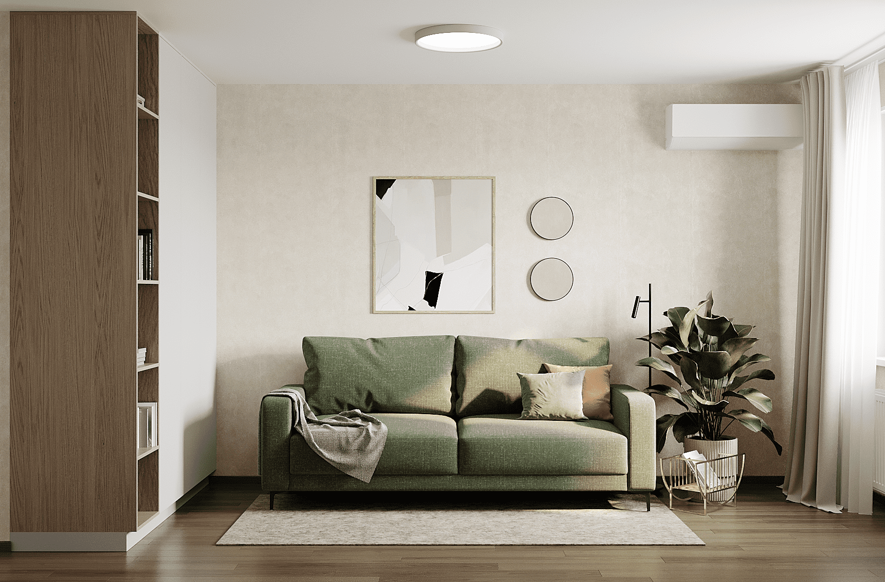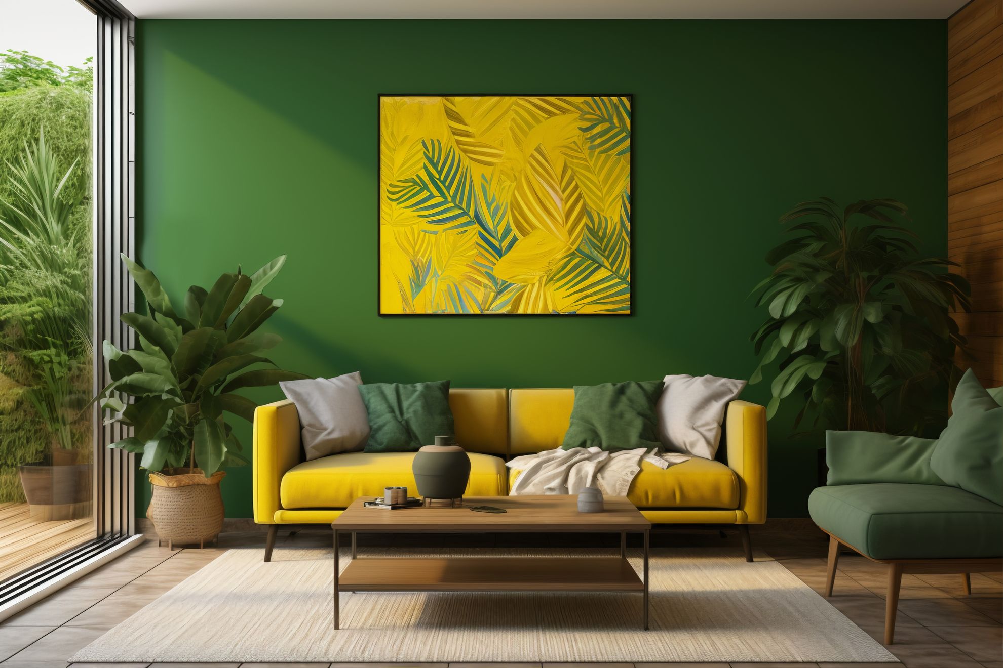 Окрашенная в сочный ярко-зеленый цвет, гостиная заполнится положительным зарядом. Применение данного цветового решения целесообразно использовать в маленьких комнатах. Таким образом создается иллюзия расширения пространства, а помещение начинает «дышать».