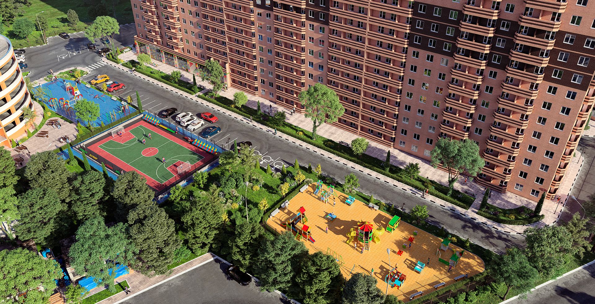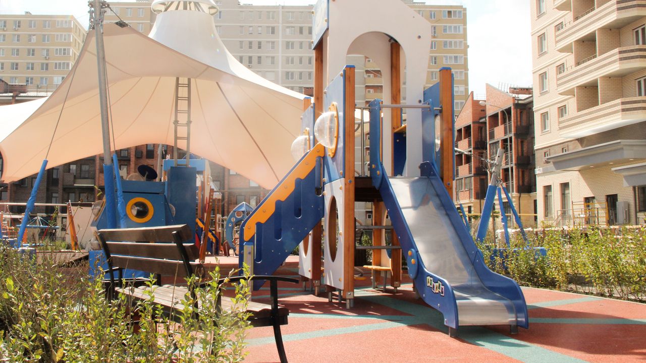 Тротуары вокруг каждого дома вымощены красивой тротуарной плиткой, предусмотрены придомовые зеленые зоны с газоном, цветами и деревьями. Установлены ограничительные столбики и велопарковки. В центральной части двора расположена парковая зона с эффектным ландшафтным дизайном. Для детей за вторым корпусом размещены детский игровой комплекс, карусели, горки, оригинальные качалки и качели, песочницы и многое другое. Для взрослых – свое собственное футбольно-баскетбольное поле, столы для пинг-понга, гимнастические тренажеры, шведские стены, рукоходы, брусья и турники. Покрытие детских площадок – прорезиненное, что дает малышам играть и бегать без оглядки, а родителям – быть спокойными за здоровье ребенка. Благодаря установленному уличному освещению вся внутренняя инфраструктура будет доступна как и днем, так и в темное время суток.